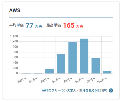 また、フリーランスのAWSエンジニアの単価は以下となっており、他の職種に比べ高い傾向にあります。